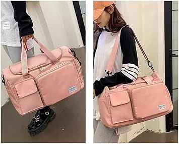 Cute and classy, this flip open duffle bag has a slight shine to the fabric and extremely spacious pockets to carry around your stuff in. The front of the bag is covered in pockets and see sides contain detachable straps.